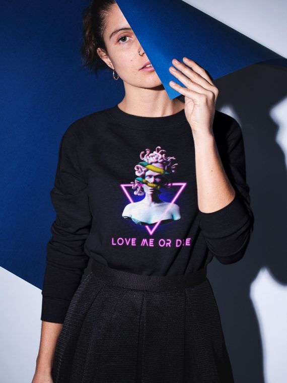 Representation of the mythological being Medusa. Punished by Athena for having sex in her temple; Medusa killed with just a glance. It is accompanied by the phrase “love me or die.”