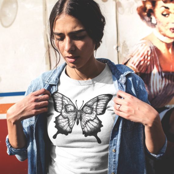 Ilustración de una mariposa en cuyas alas se dibuja una calavera. Equilibrio entre luz y la oscuridad, la belleza y la delicadeza con la oscuridad, dualidad que convive perfectamente en nuestro mundo.