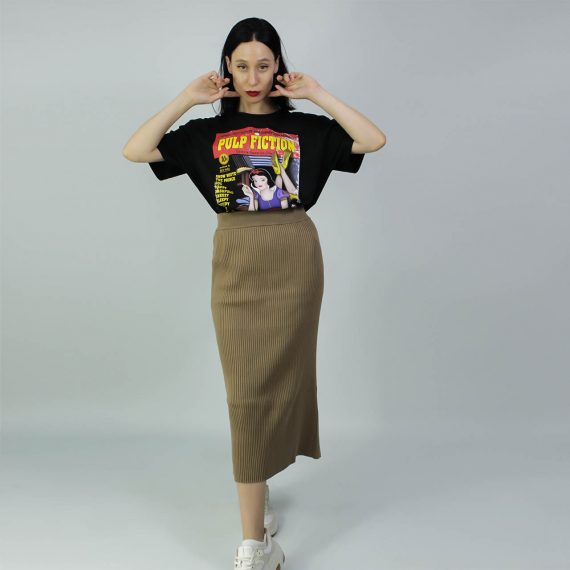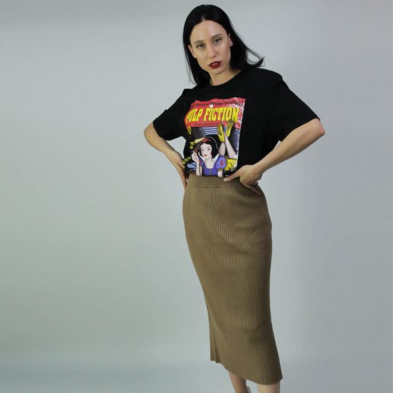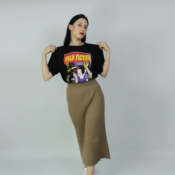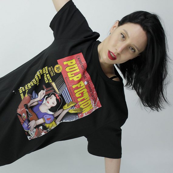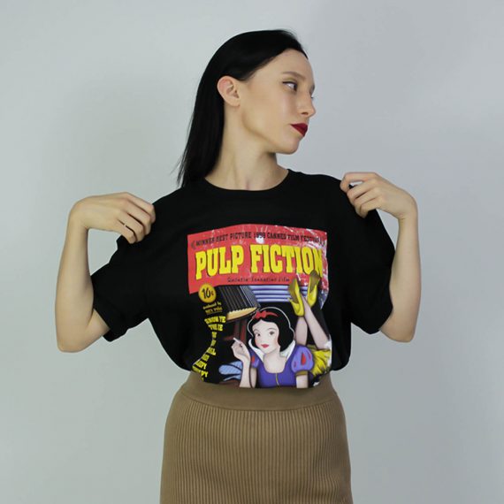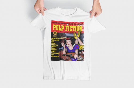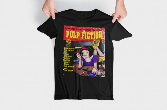 Parodia del iconico cartel de la opera prima de Quentin Tarantino, Pulp Fiction. Al personaje de Mia Wallace, una mujer adicta a las drogas, el alcohol y la fiesta, la sustituye la no tan inocente (según esta imagen) Blancanieves.