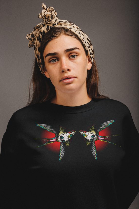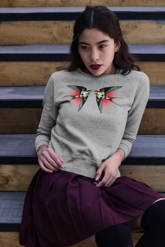 In ancient Egypt swallows were thought to be the carriers of souls to the other world. In classical seafaring culture they are a symbol of good omen since they are often the first bird to approach the mainland. They are monogamous animals, they only have one partner during their life. All this is reflected in this illustration.